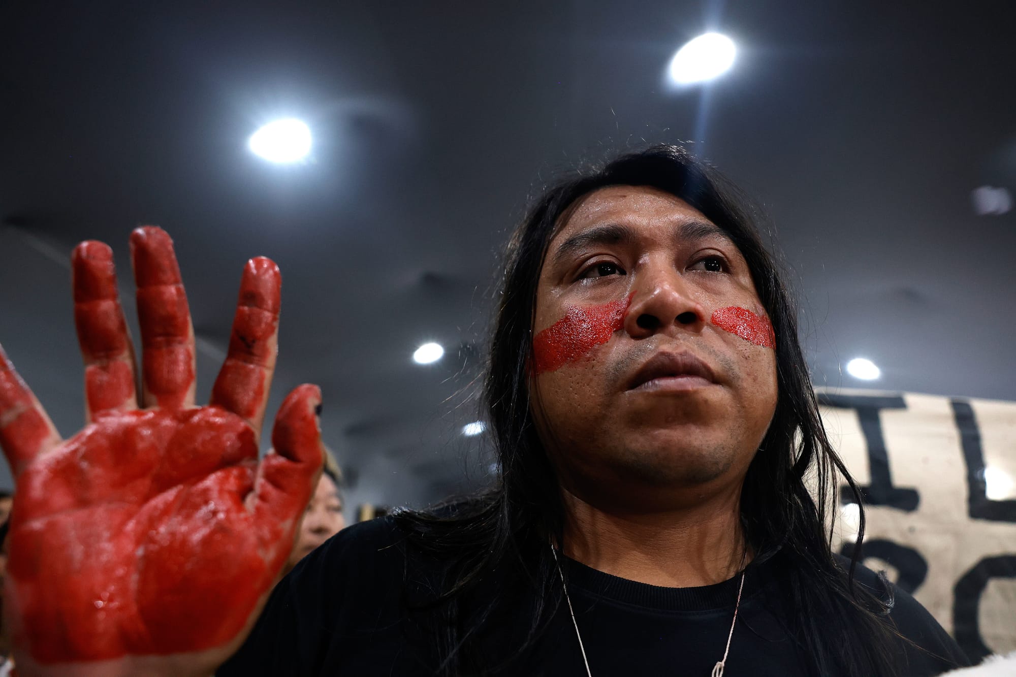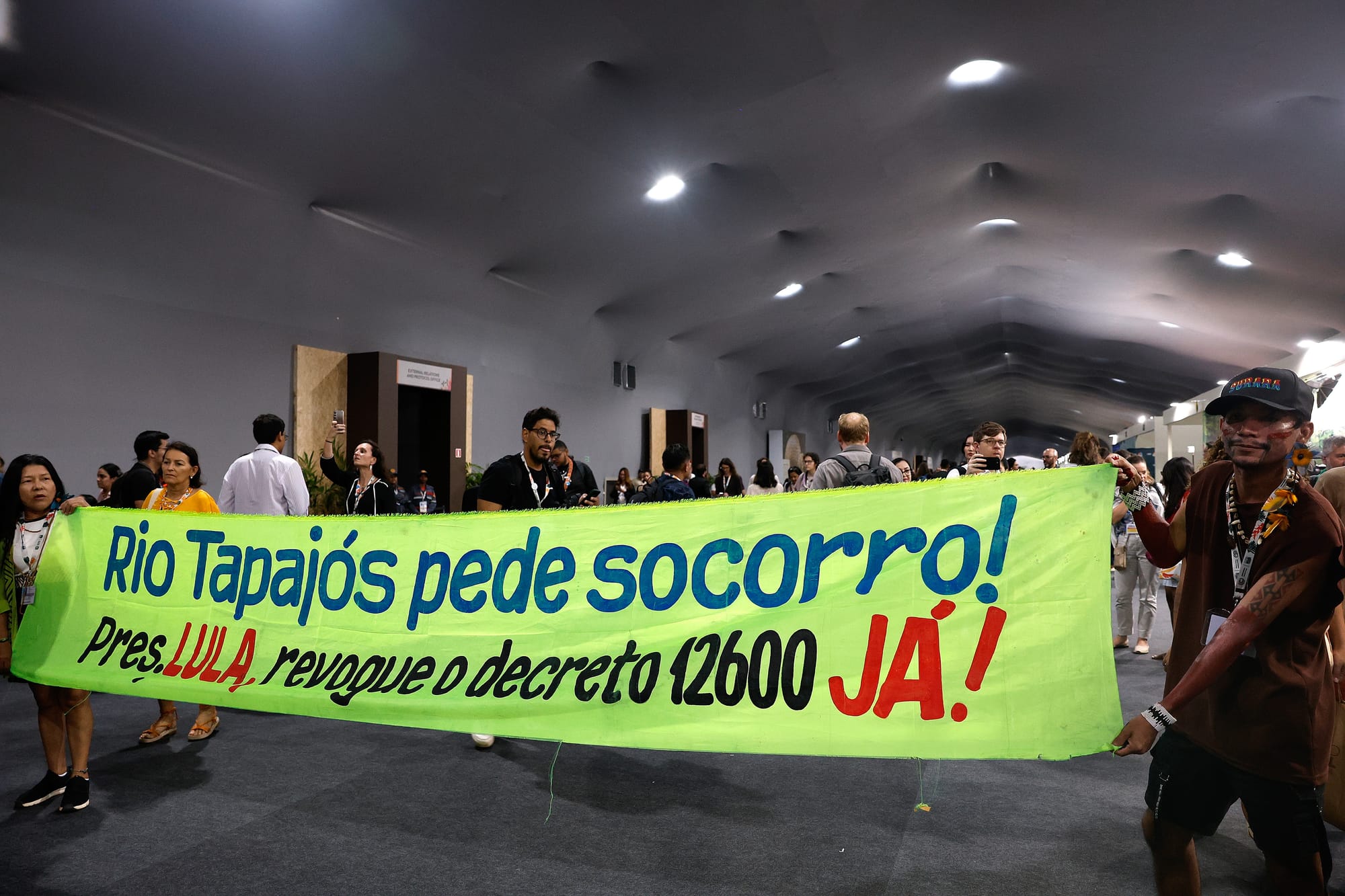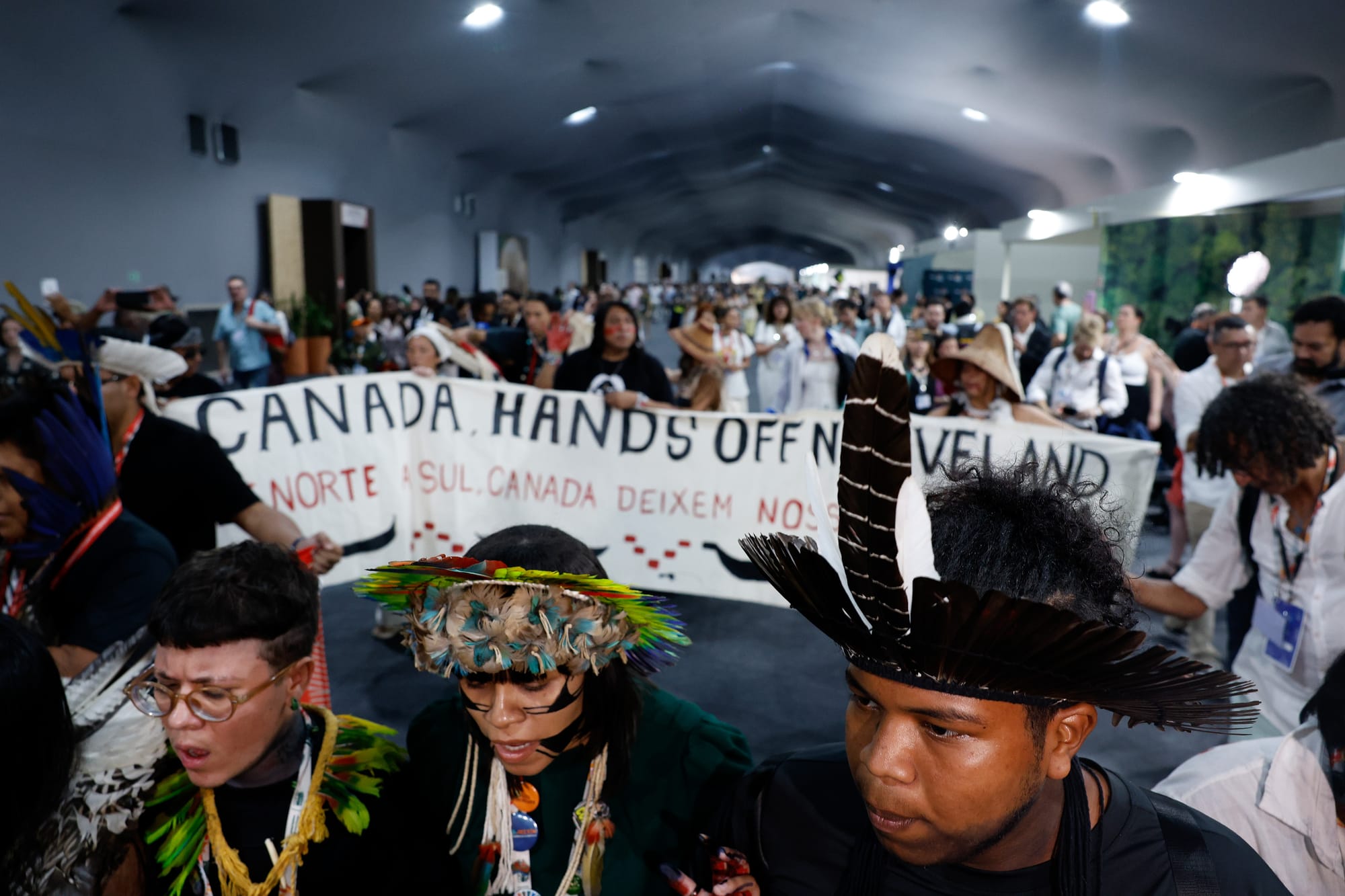 Indígenas de diferentes origens protestam no dia 21 de novembro de 2025, dentro da Blue Zone da COP30. Foi o mesmo local em que, na véspera (20.nov), houve um incêndio nas instalações do evento.