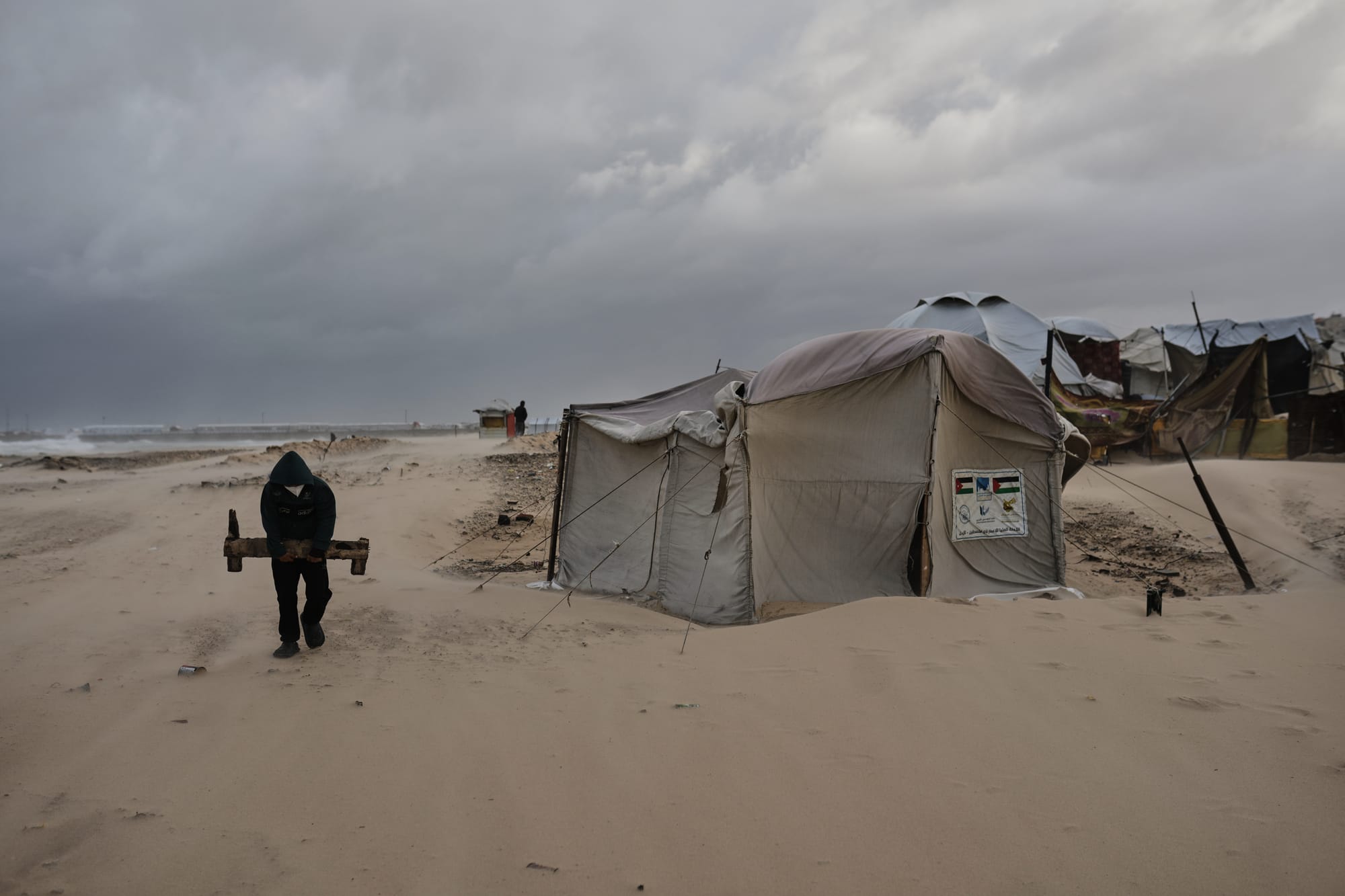 A maioria dos palestinos vive em tendas improvisadas desde que suas casas foram reduzidas a escombros durante a guerra. Quando tempestades atingem o território, trabalhadores de resgate palestinos alertam as pessoas para evitar buscar abrigo em prédios danificados, pois podem desabar sobre elas.