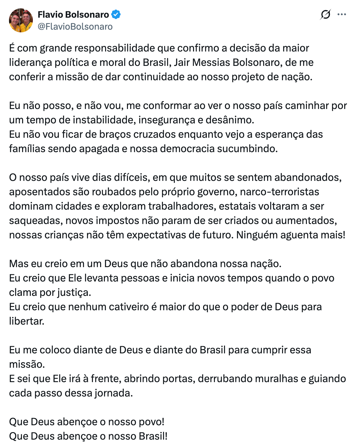 Numa sexta-feira, 5.dez.2025, Flávio anunciou formalmente que aceitou a missão de representar o movimento político bolsonarista na corrida presidencial. Disse que foi escolhido pelo pai, o ex-presidente Jair Bolsonaro (PL), a quem chamou de “maior liderança política e moral do Brasil”.